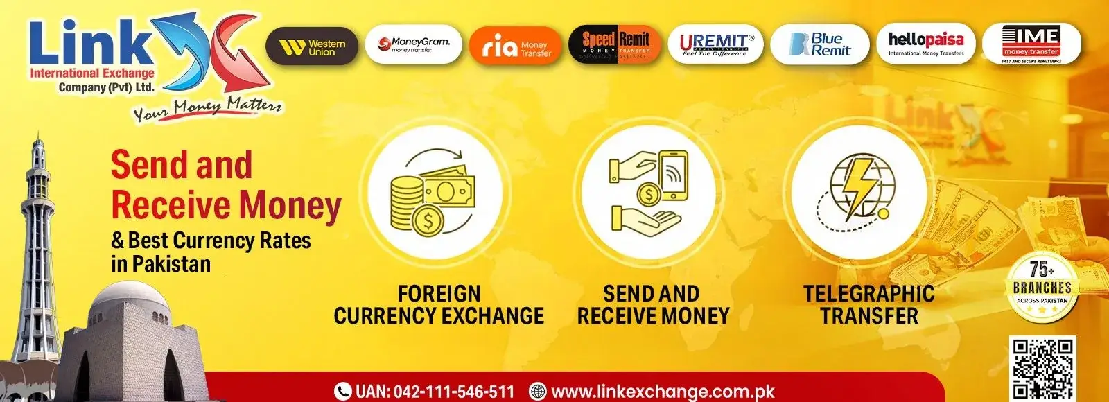 Link International Exchange operates 75+ branches across Pakistan, delivering secure global money transfers, send and receive services, currency exchange, and telegraphic