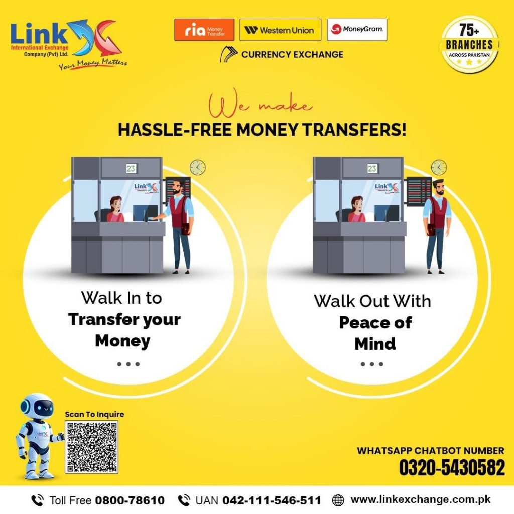 Link International Currency Exchange is a trusted currency exchange Islamabad company, serving individuals and businesses throughout Pakistan through Western Union, RIA, MoneyGram, and Intel Express. Our commitment to providing reliable and competitive currency rate today Islamabad has earned us a reputation as a go-to partner for all your foreign exchange needs. Our money exchange Islamabad Blue Area branch provides a wide range of services, including foreign currency exchange, worldwide money transfers, and study-related remittances. As a money exchange Islamabad service provider, we have a group of experienced and knowledgeable specialists who are devoted to providing you with a high-quality, reliable carrier, ensuring your transactions are clean and trouble-free.